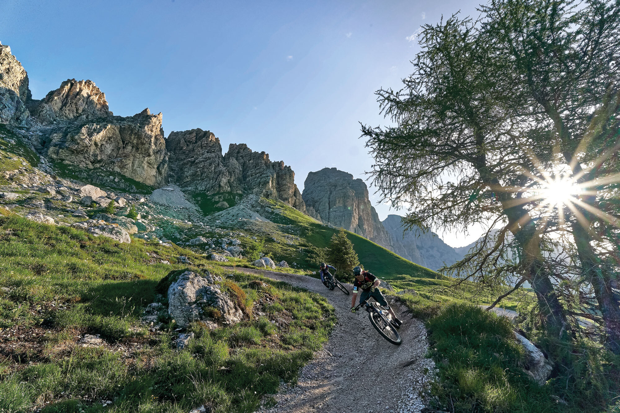 «Bon dì!», grüsst Stefan am nächsten Morgen in weichem Ladinisch. Er klingt noch etwas verschlafen. Schliesslich ist es erst fünf Uhr. «Mit etwas Glück gibt’s gleich nochmals ‹Berge in Flammen›», mutmasst er im Shuttle auf dem Weg zum Grödnerjoch. Eigentlich wäre es nett gewesen, auszuschlafen, das Frühstücksbuffet zu geniessen und dann bequem mit den Liften zum Grödnerjoch zu gondeln. «Aber ein Sonnenaufgangs-Ride dort oben ist etwas Unvergessliches», verspricht Stefan und vertreibt damit auch die letzte Sehnsucht nach der Bettdecke. Auf den letzten Metern vom Pass hinauf zum Start des Cir-Trails unterhalb der Cir-Spitzen färbt sich der Himmel am Horizont schon zartrosa und mutiert dann wenig später zusammen mit den Felsen in sanftes Orange. Wie Wachtürme stehen die steinernen Säulen der Sella auf der gegenüberliegenden Talseite. Augenblicke später schiebt sich die Sonne über den Bergkamm am Sas Ciampac und taucht den Flowtrail als veredelte Murmelbahn in goldenes Licht. «Einfach weltklasse», strahlt Moni, als sie unten am Grödnerjoch ankommt. Zumindest was das Panorama betrifft, gibt es in den Alpen wohl nur wenige angelegte Flowtrails, die dem Cir-Trail das Wasser reichen können. Zeit für ein Cornetto und einen Cappuccino!